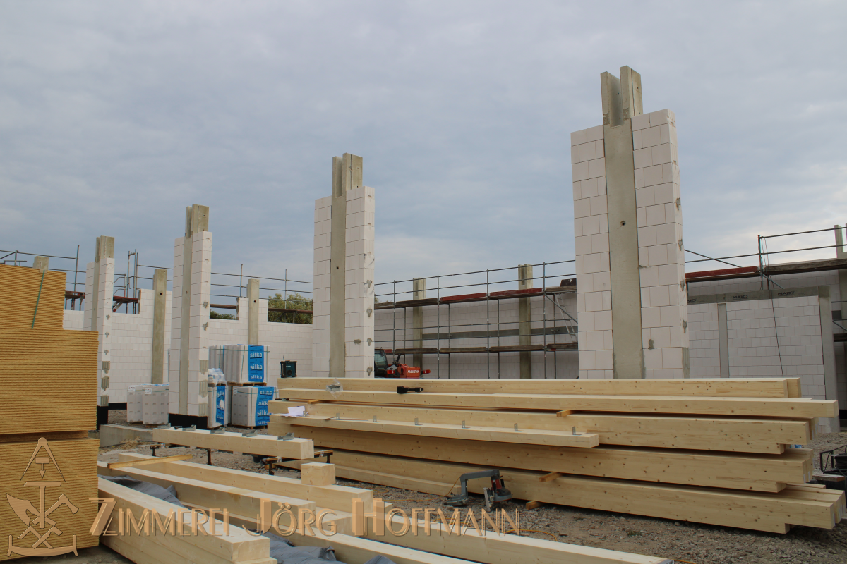 Etliche Holzbalken verschiedenster Dimension warten nur darauf verbaut zu werden. Alle zusammen bilden nach Abschluss unserer Arbeiten das tragende Grundgerüst für die Dachkonstruktion bzw. den weitern Dachaufbau.